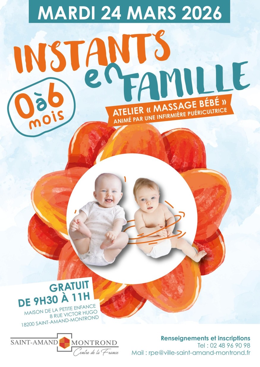 Dans le cadre du dispositif « Instants en Famille », la Ville de Saint-Amand-Montrond propose un atelier gratuit de massage bébé, animé par une infirmière puéricultrice, le mardi 24 mars, de 9h30 à 11h, à la Maison de la Petite Enfance (8 rue Victor Hugo). L’atelier est destiné aux bébés de 0 à 6 mois, accompagnés d’un parent. Inscription obligatoire auprès de la Maison de la Petite Enfance : 02 48 96 90 98 – ???? rpe@ville-saint-amand-montrond.fr