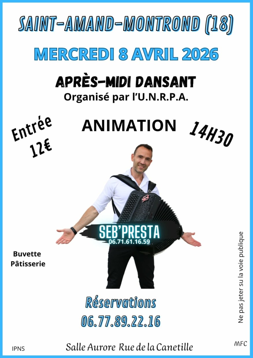 L'UNRPA organise un après-midi dansant le mercredi 8 Avril à 14h30 salle Aurore à Saint Amand Montrond animé par Seb'Presta !
